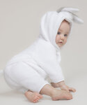 Hooded all-in-one in super-soft plush fabric with rabbit ears, eyes and nose detailed on hood. YKK zip down centre front and down leg. Tail detail on back. Binding on sleeve and leg hems. BSCI certified.