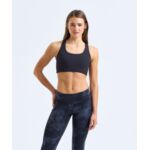 Medium-impact sports bra. Elasticated under bust for added support. Ruched detailing to centre front. Cross back straps with adjusters. Removable padding inner. Panel detailing to back with mesh detail centre. We recommend using block out vinyl and inks.Product contains no branded neck or waist label. Removable Kimble or looped garment tags. Inner seam label holds important product information on one label with a second label containing brand information which can be cut-away.