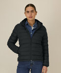 100% Recycled nylon. Women’s padded jacket. Fitted. Set-in sleeve. High collar with grown-on hood. Hood opening and bottom hem have an adjustable plastic stopper and elastic cord. Reverse nylon zip at centre front. Zipped welt pockets with extra grosgrain puller. Fully quilted. Side panels for a better shape. Self-fabric elasticated cuff. Inside seams with binding finish. Bottom hem has an adjustable plastic stopper and elastic cord.